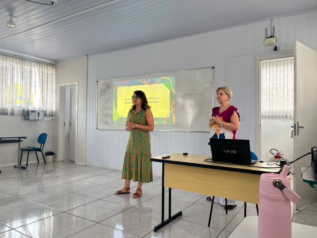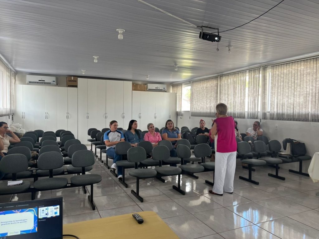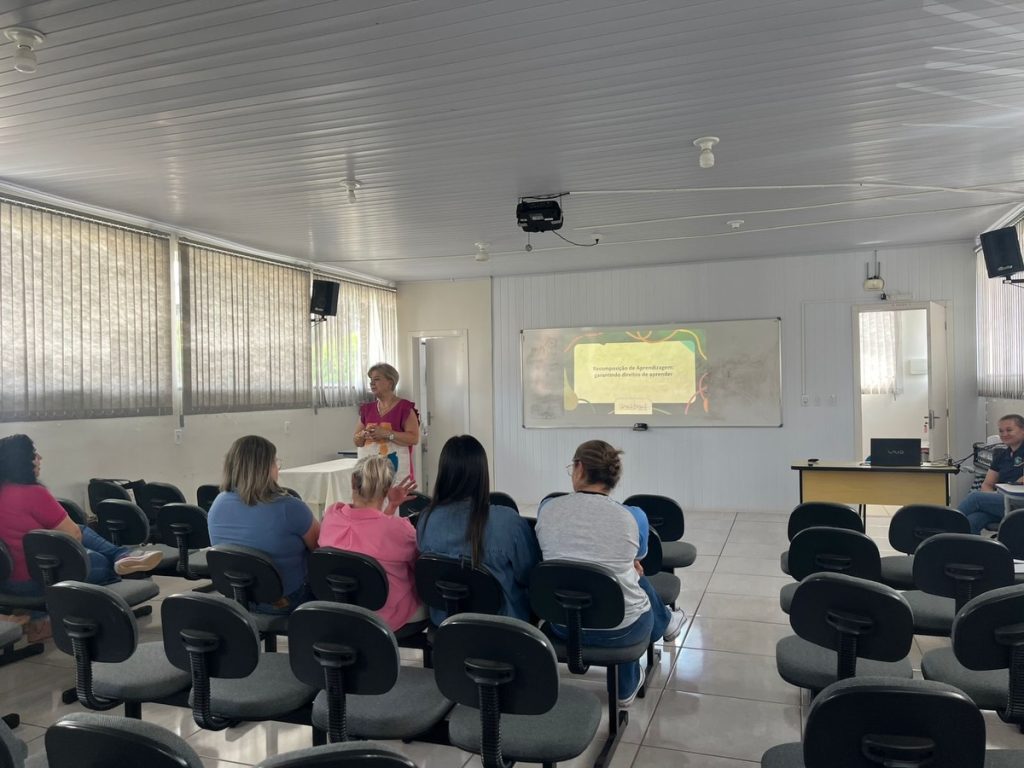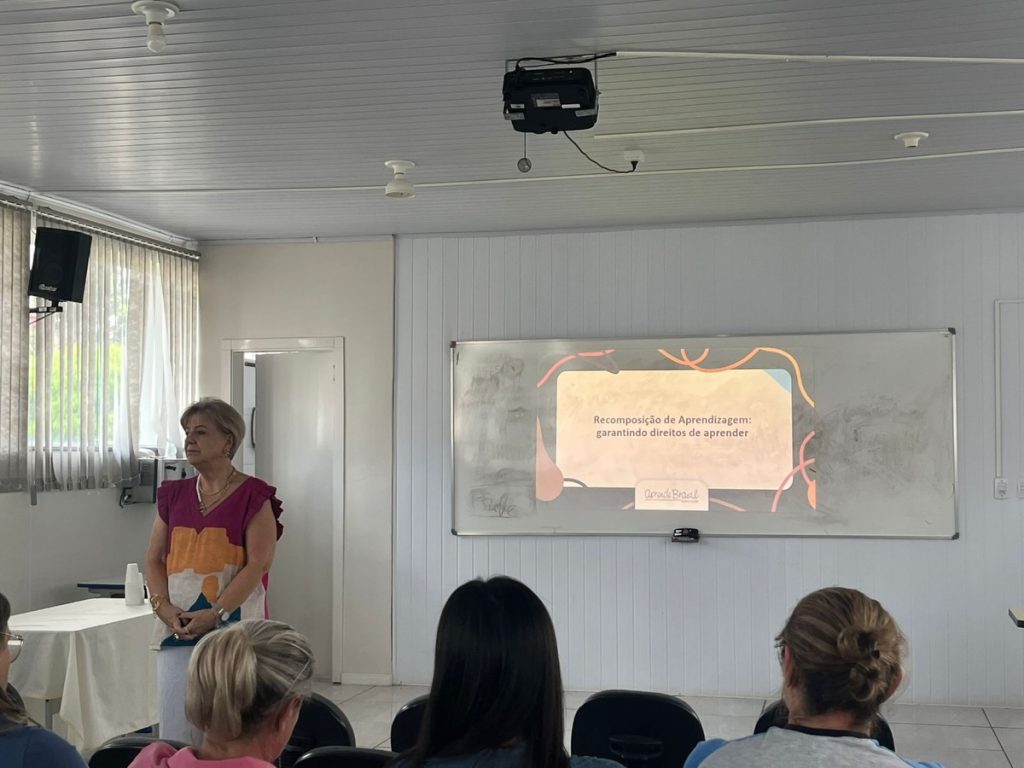Durante a formação, a professora destacou a importância da recomposição das aprendizagens, enfatizando estratégias e ações pedagógicas voltadas à recuperação das habilidades essenciais dos estudantes, especialmente diante dos desafios enfrentados nos últimos anos.