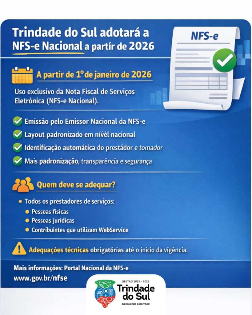 O Município de Trindade do Sul, por meio da Secretaria de Finanças, informa que, a partir de 1º de janeiro de 2026, passará a utilizar exclusivamente a Nota Fiscal de Serviços Eletrônica no padrão nacional (NFS-e Nacional) para a emissão de notas fiscais de serviços. A partir da data estabelecida, todas as notas fiscais de […]